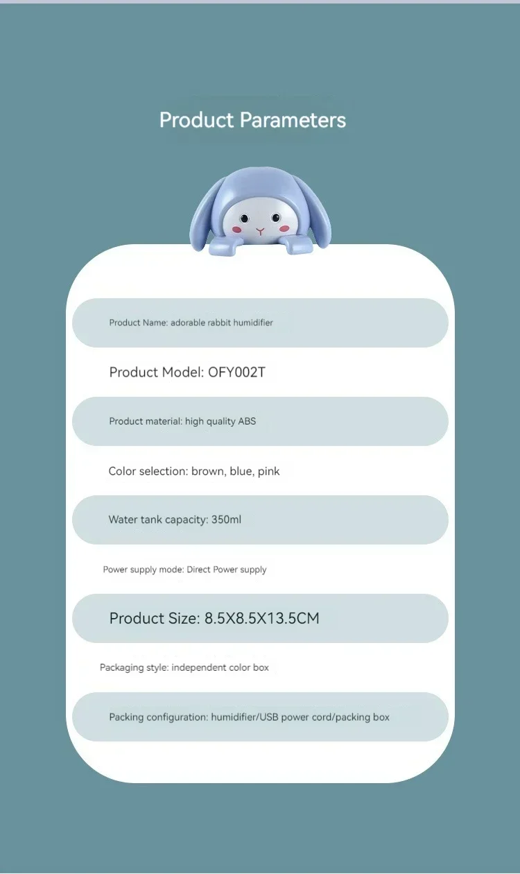 Turn dry, stuffy air into a soft, cozy atmosphere with this Cartoon Cute Rabbit Desktop Humidifier. Designed to look like an adorable little bunny, it doesnโt just hydrate your space โ it adds a touch of warmth and personality to your desk, nightstand, or car. Quiet, portable, and USB rechargeable, itโs the perfect everyday companion for better breathing, smoother skin, and a calmer mood.